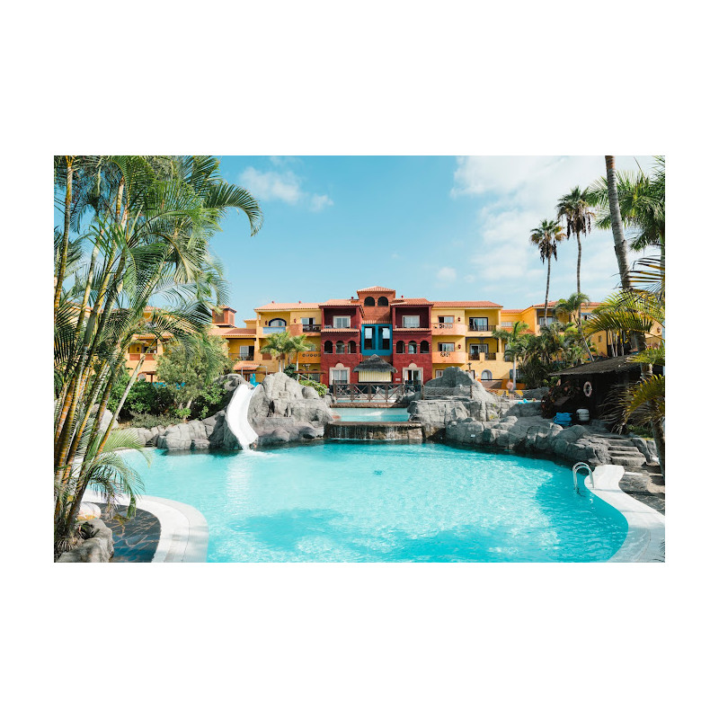 L’hotel è situato in posizione centrale a Playa de las Américas, nelle immediate vicinanze si trovano numerosi negozi, locali e centri commerciali. È immerso in un ampio e curato parco, suggestivo e pittoresco, dove si possono osservare numerosi esemplari esotici di flora e fauna che affascinano e divertono gli ospiti di tutte le età. Dista circa 20 km dall’aeroporto. La struttura ricorda un tipico villaggio andaluso costellato di vialetti e piazze. Dista circa 400 m dalla spiaggia sabbiosa. Dispone di 2 piscine di cui una di acqua di mare attorniata di sabbia fine e una climatizzabile a seconda delle condizioni atmosferiche, entrambe dispongono di una parte separata per bambini. Uso gratuito di ombrelloni e lettini solo alle piscine. Teli mare a pagamento.Ristorante principale con servizio a buffet per colazione, pranzo e cena, con angolo della pasta con show cooking, zona pizzeria con pizzaiolo italiano, settimanalmente una cena italiana. La sala ristorante è allestita con tavoli da 8 posti. Sono presenti un bar presso la piscina principale, il bar Calima situato nella piazzetta di fronte al palcoscenico utilizzato per gli spettacoli serali e uno snack bar la Taberna nei pressi della piscina. 241 camere, dispongono tutte di servizi privati, asciugacapelli, TV satellitare, connessione Wi-Fi, minifrigo, ventilatore a soffitto, terrazzo o balcone. A pagamento: cassetta di sicurezza. Il complesso dispone di doppie standard con camera con due letti singoli e salotto con divano letto e di camere familiari, uguali alle standard, ma più spaziose (min 2 adulti + 2 bambini/max 3 adulti + 1 bambino) attrezzate con 2 divani letto o letti a castello nel salotto. Sono inoltre disponibili camere superior (max 2 adulti) situate nel blocco k, unico blocco con ascensore e contraddistinte da interni moderni e minimalisti. La formula tutto incluso prevede, nei luoghi e agli orari prefissati: